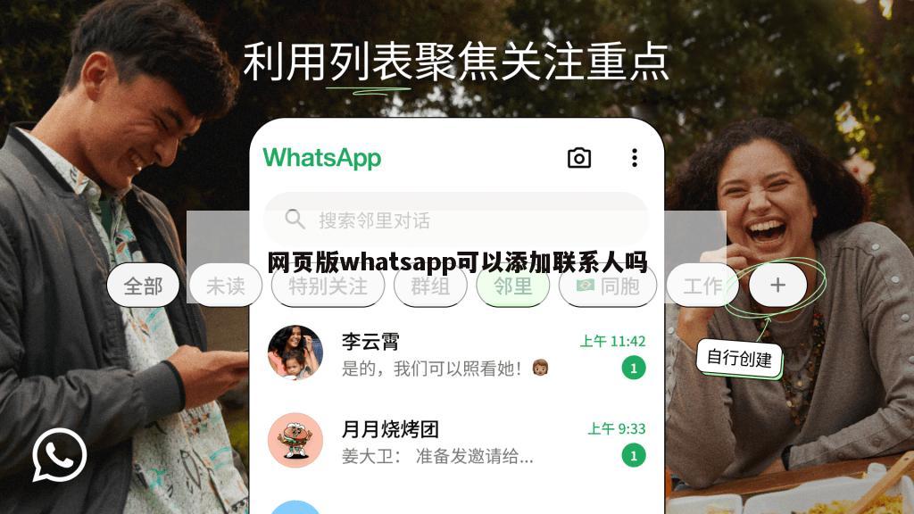点击分组后面的“+ ”号 ,输入新分组的名称,然后点击确认 。新分组创建后,你可以随时将其添加到聊天列表中,以便快速访问。WhatsApp好友管理 建好分组后 ,你就可以将对应的好友添加到分组里面了。只需点击分组下方的绿色“+”号,然后选择要添加的好友即可。